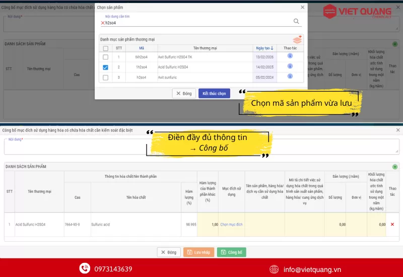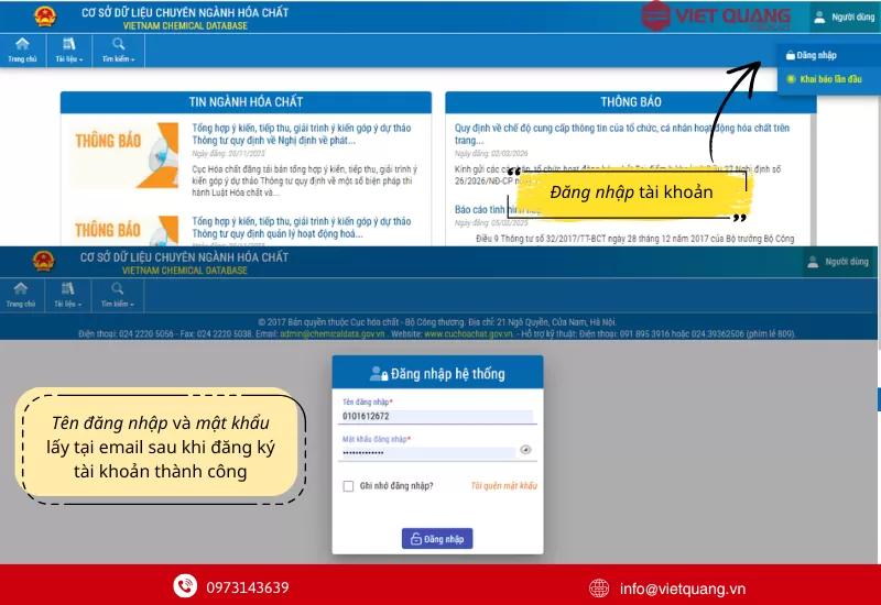 Việc đăng ký tài khoản và công bố mục đích sử dụng hóa chất đặc biệt trên Cơ sở dữ liệu chuyên ngành là một bước tiến quan trọng trong việc hiện đại hóa quản trị doanh nghiệp hóa chất. Quy trình này không chỉ giúp cơ quan nhà nước quản lý tốt hơn mà còn giúp chính doanh nghiệp tự rà soát, kiểm soát chặt chẽ nguồn lực của mình.Hãy cùng Hóa chất Việt Quang luôn theo dõi và cập nhật các hướng dẫn mới nhất từ các kênh thông tin chính thống để đảm bảo hoạt động của bạn luôn đúng quy định pháp luật.