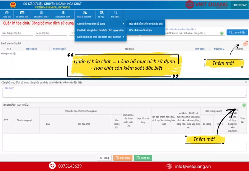 Sau khi đã có tài khoản chính thức, doanh nghiệp cần thực hiện nghĩa vụ công bố thông tin đối với các loại hóa chất thuộc danh mục kiểm soát đặc biệt. Quy trình này được thiết kế theo dạng quản lý danh mục và mục đích sử dụng: